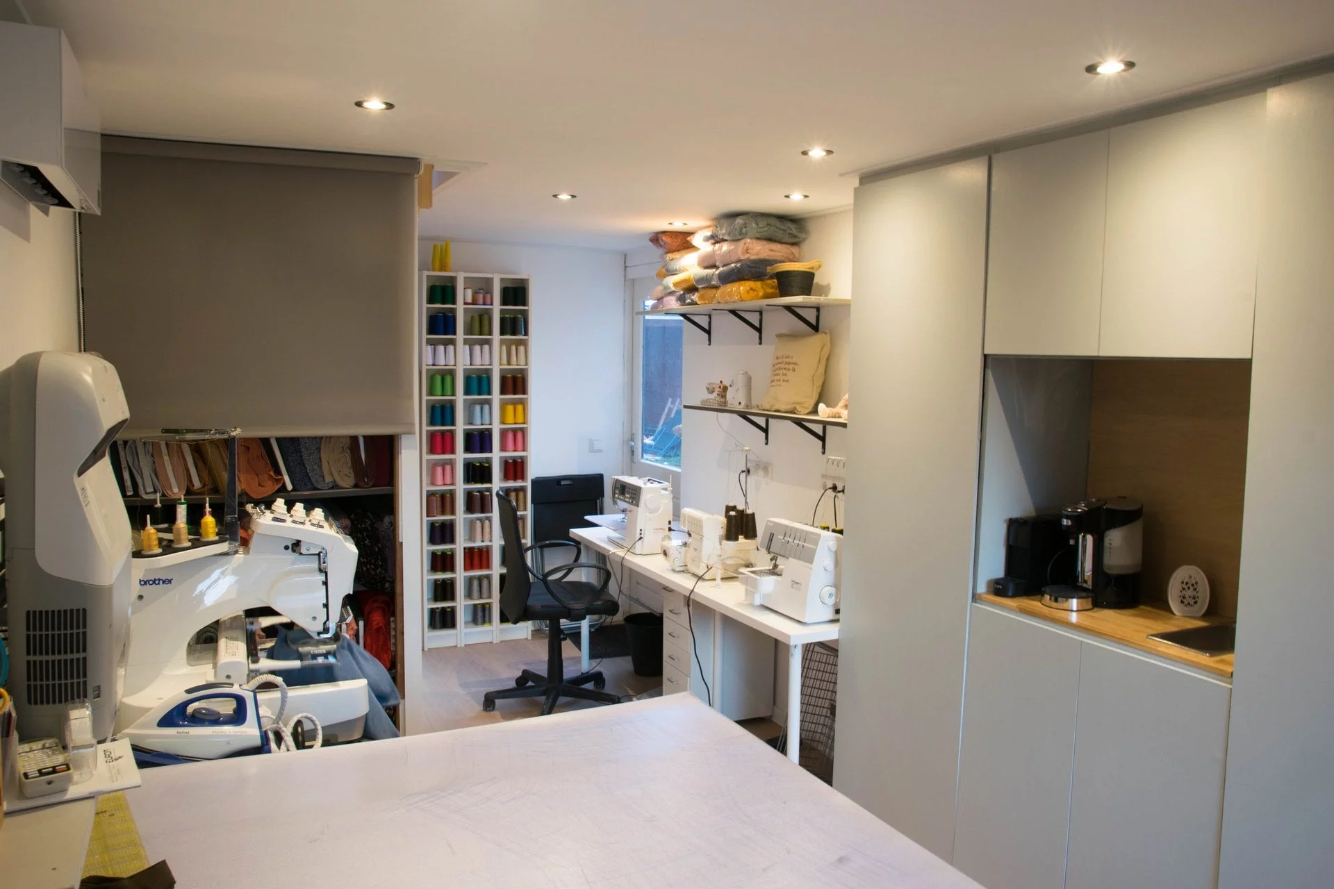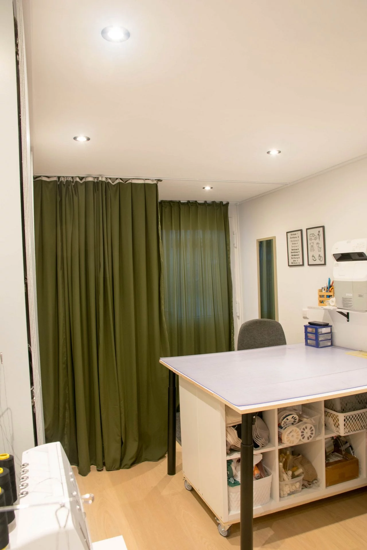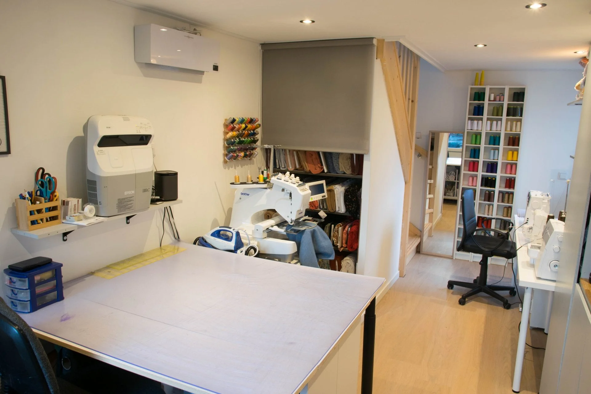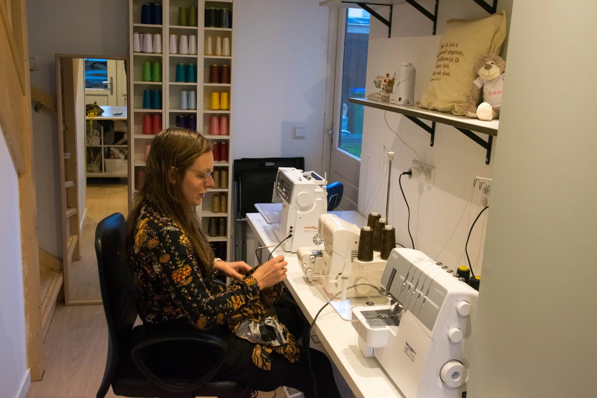 Wanneer u bij mij komt, komt u direct in mijn werkruimte. Ook de naailessen worden in deze ruimte gehouden. Er is een grote voorraad aan stoffen, garen en andere fournituren. Daarnaast kan er een pasruimte gemaakt worden door middel van twee gordijnen.
